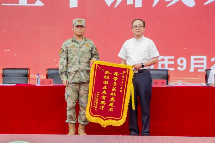 钱健代表学院向湾沚区人武部赠送锦旗,对人武部的大力支持和全体教官的辛勤付出表示衷心感谢。